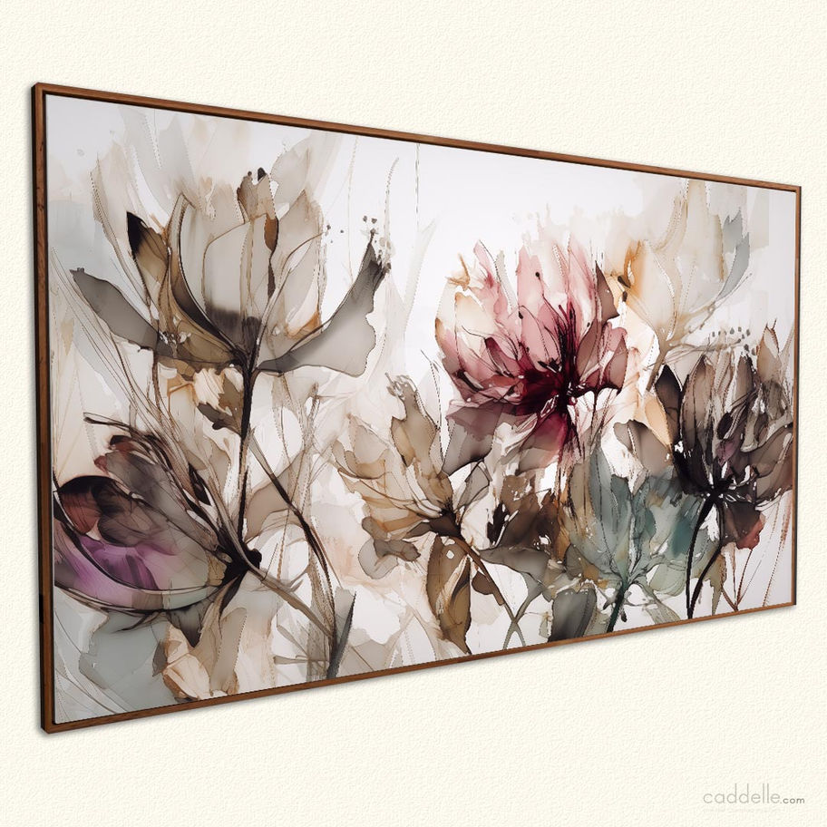 Autumn Petals transforms botanical form into an elegant dance of colour and movement. Layers of translucent ink-flow strokes create a soft, organic abstraction where petals blur gently into one another — warm siennas, muted olive greens, dusty mauves, and a single rich crimson bloom at the centre pulling the eye inward.