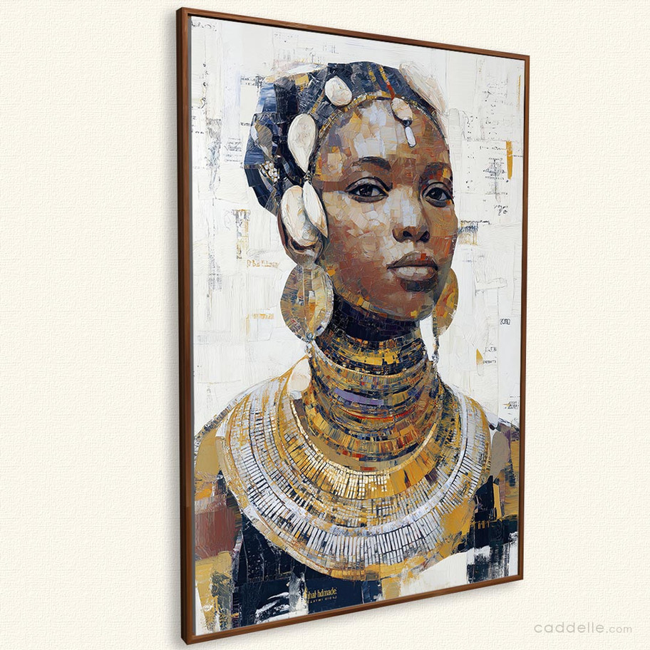 Daughter of the Sun radiates grace and strength through a masterful blend of texture and light. Painted in rich, golden ochres and earthy tones, this modern figurative work celebrates African beauty and heritage. The intricate beadwork and metallic layers shimmer against a neutral backdrop, creating a sense of timeless dignity and warmth. The subject’s calm, knowing gaze reflects inner power and serenity — a tribute to ancestral pride and feminine resilience. This piece adds depth and cultural elegance to any modern or African-inspired interior.